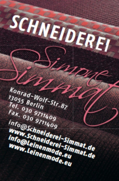 Die Inhalte dieser Website sind urheberrechtlich geschützt. Ohne schriftliche Genehmigung seitens Schneiderei Simmat darf der Inhalt dieser Seite in keiner Form reproduziert oder unter Verwendung elektronischer Systeme verarbeitet, vervielfältigt oder verbreitet werden.